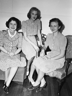 Left to right, Miss Jane Weaver, Miss Virginia Kyser and Miss Mitzi Fisch, who were hostesses at a luncheon last week at Colonial Club to honor June graduates of Our Lady of Victory Academy. Miss Weaver is sitting on a couch and Miss Kyser is sitting on the armrest of the couch. Miss Fisch is sitting on a chair to the right. They are all wearing dresses. Miss Weaver is wearing a necklace and a charm bracelet on her right wrist. Miss Kyser is wearing a ring on her right hand. Miss Fisch is wearing a ring and a charm bracelet on her right hand and a wrist watch on her left wrist. Published in Fort Worth Star-Telegram evening edition May 1 , 1940.