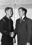 Sailor John L. Daniel, left, and Edson David Jordan, right, attending the Masonic Home and School graduation ceremony. Daniel and Jordan are standing in front of a blank wall and are shaking hands. Daniel is wearing his sailor's uniform and Jordan is dressed in a dark suit and striped tie. Daniel, who is enrolled in the Navy's torpedo school, flew to Fort Worth, Texas, from San Diego, California, to receive his high school diploma. Jordan is the class president.