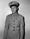 Second Lieutenant Harold R. Bailey, who has just graduated from the Corpus Christi Naval Air Station and has transferred to the Marine Corps. Lieutenant Bailey is shown standing in front of a blank wall, wearing his military uniform. He is a 1942 graduate and former football player at Amon Carter Riverside High School.