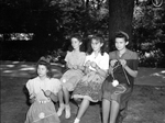 Girl Scouts at Summer Camp. Learning to knit, left to right, Katherine Dees, kneeling; Dorothy Dixon, Ruth Martin and Ruby Helen Sedenbury.