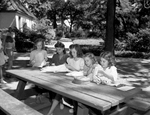 Girl Scouts at Summer Camp. Sewing, left to right, Doris Jean Page, Martha Pullen, Mary Ruth Spillers, Merle Killgo and Vivian Farmer.