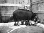 Udell Adams, of Tulia, Texas, and his hog that became the grand champion of the eighth annual Plainview Fat Stock Show. Adams is shown shown knelt behind the animal in the pig pen.