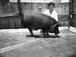 Gene Trotter and his Duroc pig that was first prize light barrow and reserve champion of the Plainview Fat Stock Show. Trotter is shown knelt behind the pig, holding a cane in his right hand. Trotter is looking directly at the camera as the pig sniffs at the ground.