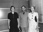 Mrs. W. K. Stripling, Lieutenant Gus Cook, and Mrs. James Leonard, who are conducting a recruiting campaign in Fort Worth, Texas, for Women Accepted for Volunteer Emergency Service (WAVES). They are standing in front of a wall and window. Mrs. Stripling is wearing a dark, short-sleeve dress, Lieutenant Cook is wearing a military uniform and Mrs. Leonard is wearing a polka-dot dress and a hat. Mrs. Leonard is also holding a pair of gloves and a pen in her left hand and has a handbag tucked under her left arm.