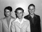 Meadowbrook Junior High School students Buddy Boyd, Nobby Padgett and Ralph Hahnfeld were awarded citizenship medals. The students are standing in front of a blank wall, all looking towards their right and smiling. Each of them are wearing different suits. Boyd and Hahnfeld were awarded by the American Legion and Padgett was a winner in the Daughters of the American Revolution contest.