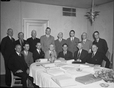 Members of the advisory board of the Supreme Court of Texas, in session in Fort Worth, Texas, are shown in their conference room at the Worth Hotel. Sitting n the front row, left to right, are Randolph L. Carter, of San Antonio, Texas, Allan D. Montgomery, of Wichita Falls, Texas, James P. Alexander, of Waco, Texas, M. N. Chrestman, of Dallas, Texas, Olin R. Van Zandt, of Tioga, Texas, W. R. Chapman, of Abilene, Texas, and William A. Vinson, of Houston, Texas. Standing, left to right, are Will E. Orgain, of Beaumont, Texas, Winborne Pearce, of Temple, Texas, Dallas Scarborough, of Abilene, Texas, Roy W. McDonald, of Dallas, Texas, J. B. Dooley, of Amarillo, Texas, Allen Clark, of Greenville, Texas, Richard F. Burges, of El Paso, Texas, and Robert E. Stayton, of Austin, Texas. All the men are wearing suits. They are gathered around a table. On the table are several books and other documents.