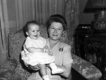 Mrs. William Shaw Nelson and Virginia Alma Nelson. Mrs. Nelson is shown sitting in an armchair holding her child in her arms. The baby is grinning very excitedly as Mrs. Nelson, formerly Miss Estelleen Kincaid, smiles and looks to her left. She is wearing a short-sleeve dress with a brooch that resembles a pair of hands. Young Virginia is wearing a small dress. Behind them is a window and curtain with a table and lamp next to it.