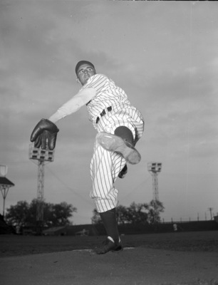Otho Nitcholas is a thirty-one year old pitcher with the Fort Worth Cats. He is shown throwing from the mound, in his big, right-handed windup. He is wearing the Cats' home pinstripe uniform. His teammates are practicing in the outfield.