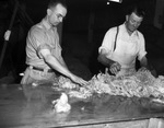 Frank Reeves Senior pictures. C. D. Cran of Stanford, Maine, and J. H. Simmens. The duo is shown working with a large pile of wool hair set on top of a table. Both men have their sleeves rolled up and appear focused. Cran is wearing a pair of eyeglasses and Simmens is wearing an apron over his clothes.