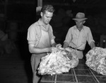 Frank Reeves Senior pictures. Cy Woods of Boston, Massachusetts and J. L. Kleinecke of Fort Worth, Texas. Woods is shown compacting and grading the wool as Kleinecke looks on. Woods is wearing an apron over his clothes while Kleinecke is wearing a striped, buttoned-up shirt with a belted pair of trousers and a hat. Next to him is another bundle of wool.