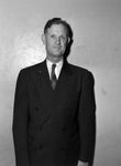 B. H. Manning was elected grand knight of the Bishop Dunne Council of the Knights of Columbus. He is shown standing in front of a blank wall, wearing a pinstripe, double-breasted suit with a checkered necktie.