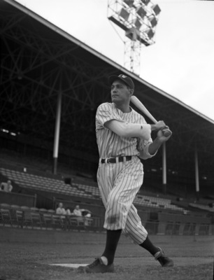Henry "Prince" Oana is in his first season with the Fort Worth Cats. The thirty year old outfielder is living up to his reputation as a long-distance hitter. He is 6-15 with two doubles, a triple, and a homerun. Oana is shown in the follow-through of his powerful right-handed swing. He is dressed in the Cats' home pinstripe uniform and has a stain on the knee from sliding.
