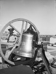 The deep-throated clamor of this bell--the "Maria Assumpta"--joined by the old "Patricius" and the new and smaller "Maria Glorisa" -- will be at 7 p.m. Saturday when they herald the Pentecostal Sabbath Eve. Helping to install the bells in the tower of Saint Patrick's Catholic Church is Ed Gies, shown here. He has worked for the church for 40 years. Published in The Fort Worth Star-Telegram Morning Edition June 11, 1943.
