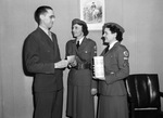 $340 worth of pledges to buy cigarettes for soldiers overseas. G. L. Messer, Lieutenant Gladys Foote and Corporal Gladys Mitchell. Messer is shown is shown presenting the checks to Foote and Mitchell of the Fifth Battalion Texas Guardettes. The women look up Messer and smile as they accept the pledges. Messer is wearing a dark suit and a pair of eyeglasses while Foote and Mitchell are wearing guardette uniforms. Behind them is a chair.
