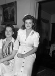 Miss Martha Jones (Akron, Ohio), Miss Peggie Joan Mosshart (Houston, Texas). Miss Jones and Miss Mosshart are shown sharing a seat and smiling at the camera. Miss Jones is wearing a striped, collard blouse and a long skirt and Miss Mosshart is wearing a long, buttoned dress with ruffles on her shoulders. They both also have small flower hair accessories in their hair. Behind them, there is a a wall with a hanging picture and a doorway.