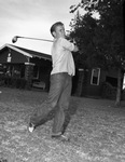 Kenneth "Corky" Wade, 14, swinging a golf club. Mr. Wade qualified for the Glen Garden Invitation. He is the youngest son of C. B. Wade, assistant pro at the golf course who has a family of golfing sons. He is wearing a collared shirt with the sleeves rolled up and jeans. Behind him are several trees and a house.