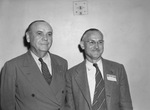 W. N. Tolleson, left, of Dallas, Texas, past district governor of Civitan International for Texas, was elected president and installed in ceremonies at the 23rd annual convention of Civitan International at Hotel Texas. Standing beside him is Dr. Earl T. Brown, of Glendale, California, vice president of the organization. Both men are standing in front of a bare wall, wearing suits. Dr. Brown is wearing eyeglasses and a name tag.