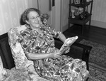 Mrs. Rena B. Conway, formerly with the Mineral Wells Index. Mrs. Conway is shown seated in a floral patterned couch with a newspaper in her hands. She is wearing a pair of eyeglasses and a leaf patterned, short-sleeve dress. Mrs. Conway started her writing career as Rena Bonner, and for her first article-a love story- she received a book in lieu of pay. Her first article was published in 1899. She has a sister Mrs. R. B. Craft, two children and was married twice.