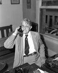 Cony Warren Woodman was a labor leader and, for nearly a half-century, was the owner, publisher, and editor of "The Union Banner," a Fort Worth labor publication Woodman is shown seated at a desk, on the phone while he smokes from a pipe. He is wearing a pair of eyeglasses and a suit. In front of him is a typewriter set on the desk. Behind him, a bench and a window can be seen.