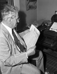 Cony Warren Woodman was a labor leader and, for nearly a half-century, was the owner, publisher, and editor of "The Union Banner," a Fort Worth labor publication. Woodman is shown reading from a newspaper while he is seated at a desk. He is wearing a pair of eyeglasses and a suit. In front of him is a typewriter set on the desk.