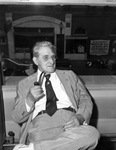 Cony Warren Woodman was a labor leader and, for nearly a half-century, was the owner, publisher, and editor of "The Union Banner," a Fort Worth labor publication. He is shown seated in front of a large window holding a smoke pipe in his hand towards his face. Woodman is wearing a pair of eyeglasses and a suit. He also has his legs crossed. Through the window, the street below can be seen.