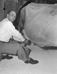 Superintendent John H. Willams milks a cow in the dairy at the Tarrant County, Texas Orphans Home. He is wearing a shirt, trousers and eyeglasses.