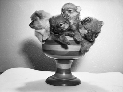 Image shows the four little Pomeranian puppies that Mrs. Clyde Hill bred . They are five and a half weeks old, and are small enough to fit in a water glass. The four puppies on the left are darker in color while one on the right is lighter. They are shown to be in a cup. Their father is Little o' Treasure Gold and their mother is Artistic Miss Luxury. Published in the Fort Worth Star-Telegram morning edition, May 12, 1940.