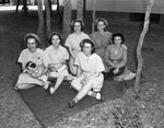 Women's Army Auxiliary Corps. Back left to right: Auxs. Betty Marshall, (Crosbyton) Beulah LaRue, Margie Norris, Tioga. Bernice Jarue, Arlington, Texas, and front Birdie Flippo, Auxiliary Marshall is holding "Stinky" mascot.
