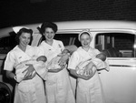 Ferguson triplets. Nurses, left to right, Kathleen Woodier, Faye Jones and Myrlene Smith. They are holding the Ferguson Triplets, Nina Sue, Tina Ruth and William Roy.