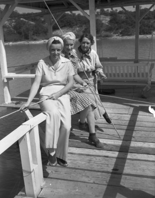 Eagerly waiting for the fishing season to open are these Lake Worth, Texas, fisherwomen. They are, left to right, Miss Lorraine Miller, Mrs. Ivy Winters, and Mrs. T. Z. Ham. The women took their fishing poles to the dock to practice untangling their lines. Miss Miller is dressed in a blouse and trousers and her hair is tied in a scarf. Mrs. Winters is wearing a checkered dress. Mrs. Ham is dressed in a button-up blouse and trousers. There is a porch swing in the background, overlooking the lake.