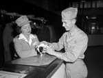 Service Men's center. Private Harold Gray, Dubank, Louisiana, checks his dog, "prop." Mrs. Fred McFarland is the Red Cross worker.