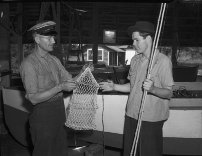 Eagerly waiting for the fishing season to open at Eagle Mountain Lake in Lake Worth, Texas, are Louis Lowery, left and Dan Reese. Mr. Lowery is selling a fishing net to Mr. Reese, who plans to catch a whopper. Mr. Lowery is an employee at Holden Boat Works. He is wearing a peaked cap, button-up shirt with cuffed sleeves, and trousers. Mr. Reese is dressed in a hat, shirt, and trousers. He is carrying a couple fishing poles. There is a small boat in the background.