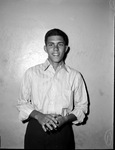 Marvin Elmer Fowler Junior, 17, celebrated his birthday by enlisting in the Navy as an apprentice seaman. He is the son of Mr. and Mrs. M. E. Fowler and he attended McLean Junior High School. He attended high school in Indianapolis, Indiana. He is standing in front of an empty wall, smiling. He is wearing a striped, long-sleeve shirt and trousers.