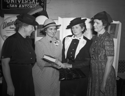 The goal of the People's Library Movement is for every Texan to have library service. A permanent organization is being formed with that objective in mind. Leaders of the movement met at the Blackstone Hotel. They are, left to right, Mrs. George West Diehl, Mrs. E. H. Marek, Mrs. John C. Murphree, and Mrs. L. R. Wade. Mrs. Diehl, of Corpus Christi, Texas, is dressed in a hat, button-up blouse, and a skirt. Mrs. Marek, of Yoakum, Texas, is wearing a hat and a polka-dot dress. Mrs. Murphree, of Dallas, Texas, is dressed in a hat, a blouse with pearl buttons and a wide collar, and a skirt. Mrs. Wade, of Livingston, Texas, is wearing a hat and a button-down dress.