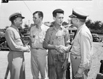 Inspection of Fort Worth war plants by Navy officials. Admiral Foote congratulating E. A. French, worker at the American Manufacturing Company plant. (two men at left not identified).