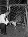 Julian Frazier is a zookeeper at Forest Park Zoo. He purchased 432 chickens for the big cats and other meat eating animals at the zoo. He is holding one of the chickens in front of a lion as her Fourth of July treat. Mr. Frazier is wearing a dress shirt, necktie, and trousers.