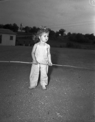 There is commotion on the shores of Eagle Mountain Lake as thousands of anglers are ready for the season's opening at midnight. One interested observer is Carol Ann Sheeley, of Dallas, Texas. She is the 21-month-old daughter of Mr. and Mrs. E. L. Sheeley. She is holding fishing pole. She is dressed in overalls and has a bow in her hair.