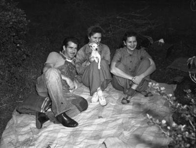There is commotion on the shores of Eagle Mountain Lake as thousands of anglers are ready for the season's opening at midnight. Three Fort Worth, Texas, fishermen arrived early to grab some sleep before it was time to drop their hooks and lines. Left to right, they are K. Wallace, Miss Clara Nell Tutor, and Miss Alma Brock. Mr. Wallace is wearing a t-shirt and jean overalls. Miss Tutor is wearing a jean jacket, skirt, and a wrap in her hair. A small dog is sitting on her lap. Miss Brock is wearing a button-up blouse and trousers.