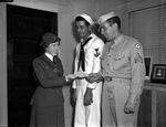 Major Jimmie Myer, Texas Guardette, handing a piece of paper to Sergeant Dick Zimmerman, right, of Detroit, Michigan, as George M. Stancoff, center, Machinist's Mate Second Class, looks on. The three are wearing their respective military uniforms. Behind them is a shelf with framed pictures on it and a window with the blinds closed. The piece of paper is a $3,500 "cigarette" representative of the 1,300,000 cigarettes for men overseas which have been purchased by the Fort Worth Guardettes in their "Share a Smoke With Our Boys" campaign.