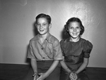 These sixth grade pupils at Carroll Peak School will reign as king and queen at the annual "Play Day" festivities. They are, left to right, Bobby Weaver and Joy Sweatt. Bobby, 12, is the son of Mr. and Mrs. Austin Weaver. He is dressed in a short-sleeve button-up shirt and trousers. Joy, 11, is the daughter of Mr. and Mrs. Elwood Sweatt. She is wearing a dress. The students are sitting on a bench.
