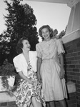 Miss Margaret Moore (standing) of Hattiesburg, Mississippi, is visiting Miss Jean Gilliland (seated, left), daughter of Mr. and Mrs. C. I. Gilliland. They attend Whitworth College, Brookhaven, Mississippi, where they are sophomores. Miss Moore is the daughter of Mr. and Mrs. A. C. Moore. They are outside of the home of Miss Gilliland. Behind them are several trees. Miss Gilliland is wearing a floral print dress and a blazer. Miss Moore is wearing a dress with buttons all down the front and ruffle detailing on the bodice and sleeves.