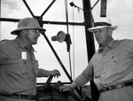 Kermit Ordovician Oil Pool is located in Winkler County, Texas, and is being drilled by the Magnolia Petroleum Company. Stationed at one of the outposts, left to right, are Lee Moore and Ted Wilson. Mr. Moore is wearing a safari hat, button-up shirt and trousers. Mr. Wilson is dressed in a hat, button-up shirt, and trousers.