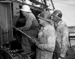 Kermit Ordovician Oil Pool is located in Winkler County, Texas, and is being drilled by the Magnolia Petroleum Company. Stationed at one of the outposts, left to right, are S. L. Wooten, P. W. Medlock and Ed McLendon. They are working on the number 21 State-Walton. All three men are dressed in hardhats, long-sleeve shirts, and overalls.