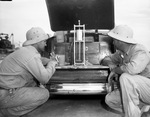 Kermit Ordovician Oil Pool is located in Winkler County, Texas, and is being drilled by the Magnolia Petroleum Company. Stationed at one of the outposts, left to right, are Lee Moore and A. C. Smith. They are shown squatting to inspect a piece of machinery. They are both dressed in a safari hat, button-up shirt, and trousers.