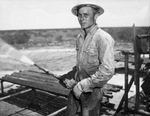 Kermit Ordovician Oil Pool is located in Winkler County, Texas, and is being drilled by the Magnolia Petroleum Company. Stationed at one of the outposts is W. C. Warnick. He works on an oil derrick and is shown spraying a hose from a platform. He is dressed in a hardhat, button-up shirt, trousers, and gloves.
