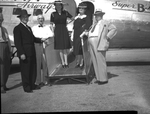 Included in the party which made the first official flight inaugurating the Graniff Airline's route to Denver, Colorado were (left to right) C. E. Faulk, president of Delta Airlines, Monroe, Louisiana; Mrs. Alex W. Terrell, the former Jean Braniff, Dallas, Texas, and Fort Worth Mayor and Mrs. McCrary. (Man at extreme left not identified.) The group is standing next to a Braniff airplane. The women are standing on a small passenger ramp extending from one of the plane's exit doors. The men are wearing suits and ties. The women are wearing dresses and hats. This photograph was published in the July 21, 1943 evening edition of the Star-Telegram.