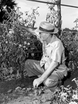 J. L. Hawkins and his prize victory garden looking at tomatoes.