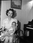 Mrs. John L. Van Dyke is posing with her son, John Lee Junior. She is married to Lieutenant John "Johnny" Van Dyke. The lieutenant is a bombardier in the United States Army Air Corps and a former employee of the Fort Worth Star-Telegram. He has been stationed in Hawaii since October and has never seen his son. Mrs. Van Dyke is trying to teach her three-and-a-half month old son to say "Da-da," so he will be able to greet his father. She is sitting on a chair, wearing a lacy dress and a checkered apron. John Junior is on his mother's lap, wearing overalls. There is a piano in the background, and a painting hanging on the wall.