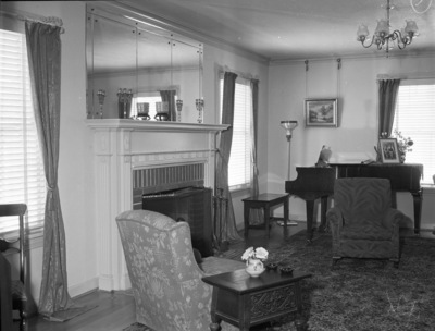 Nowlin, Harold C.; Nowlin, Harold C. (Mrs.); Fort Worth Star-Telegram Home Show; Living rooms; Chairs; Lamps; Windows; Draperies; Pianos; Fireplaces; Mantels; Mirrors