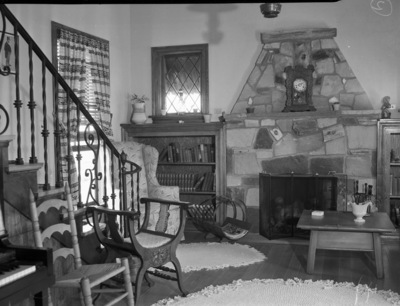 The Fort Worth Star-Telegram is doing a feature story on stand-out homes in Fort Worth, Texas. Featured in the Home Show is the living room of the Mack Clark home. The room is decorated with early American style furniture and accents, including a large stone fireplace. On the fireplace mantel is a clock. Hooked rugs cover the floor, and a staircase leads up to an overhanging second-floor balcony. Beside the fireplace, at left, is a bookcase and a sofa chair. In the foreground, at left, is a piano (partially obscured).